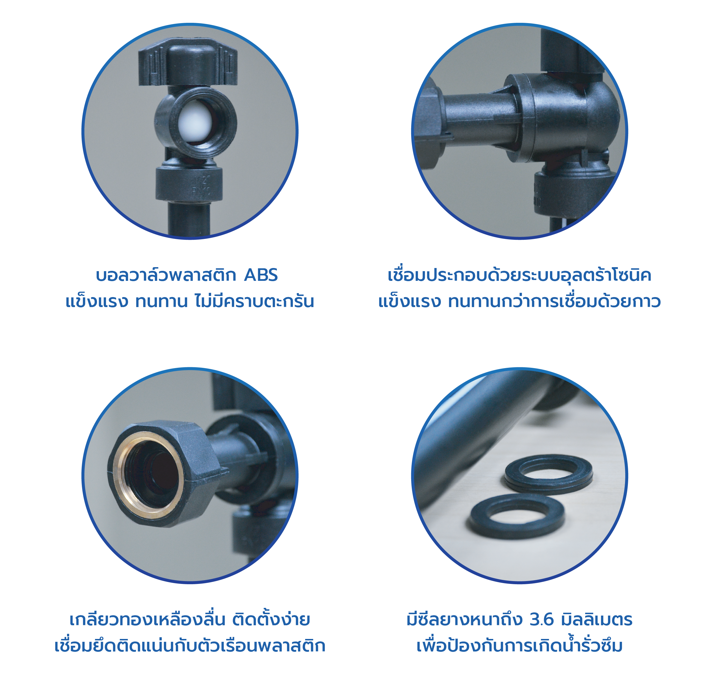 ใช้ บอลวาล์วพลาสติก ABS ที่มีคุณสมบัติแข็งแรง ทนต่อแรงกระแทก ไม่มีการเกิดสนิมหรือคราบตะกรัน ใช้งานได้นานโดยไม่ต้องกังวลเรื่องการเสื่อมสภาพ