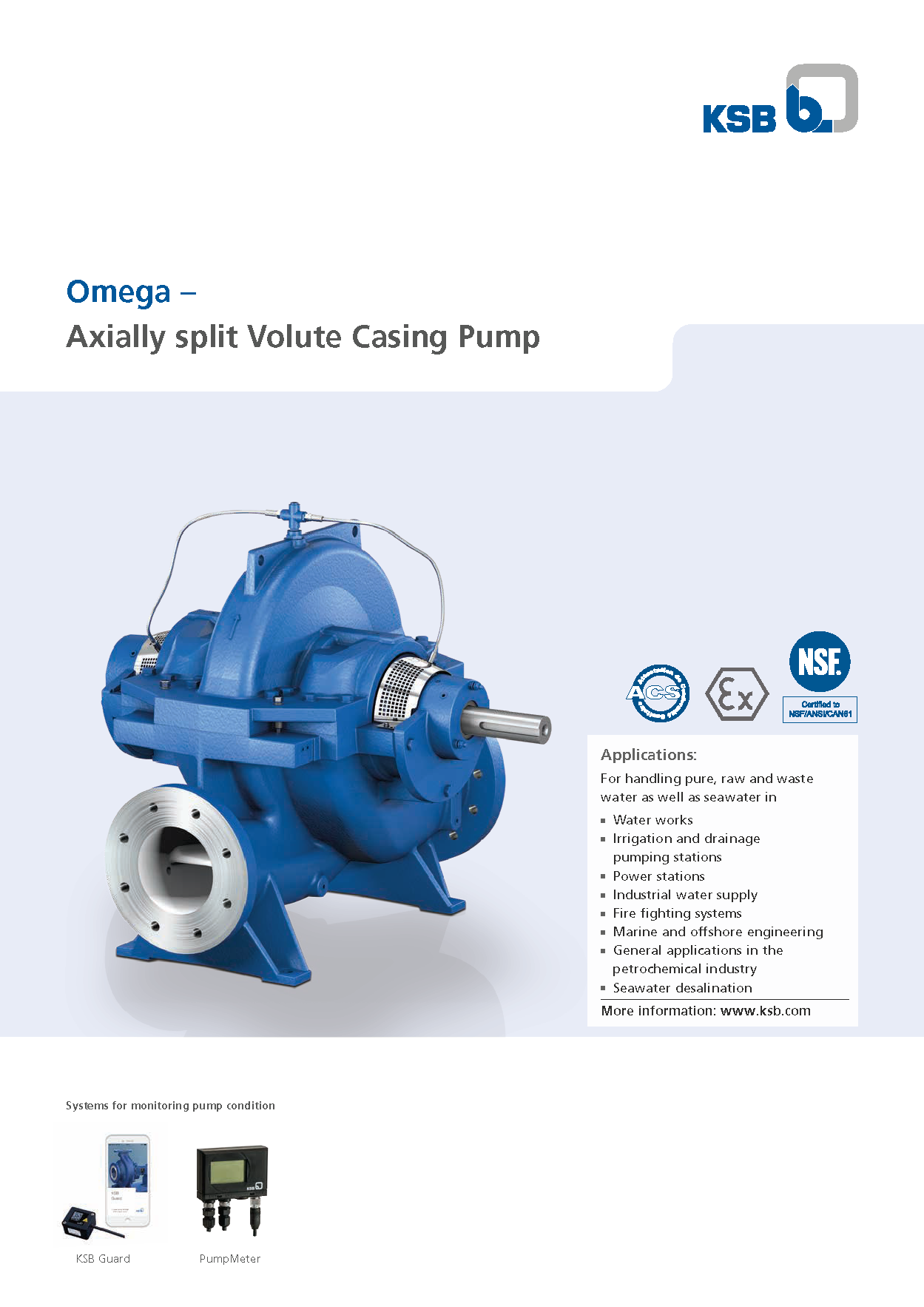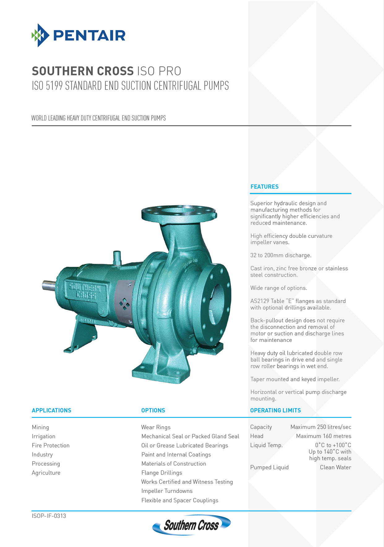 Superior hydraulic design and manufacturing methods for significantly higher efficiencies and reduced maintenance. High efficiency double curvature impeller vanes. 32 to 200mm discharge. Cast iron, zinc free bronze or stainless steel construction. Wide range of options. AS2129 Table “E” flanges as standard with optional drillings available. Back-pullout design does not require the disconnection and removal of motor or suction and discharge lines for maintenance. Heavy duty oil lubricated double row ball bearings in drive end and single row roller bearings in wet end. Taper mounted and keyed impeller. Horizontal or vertical pump discharge mounting.