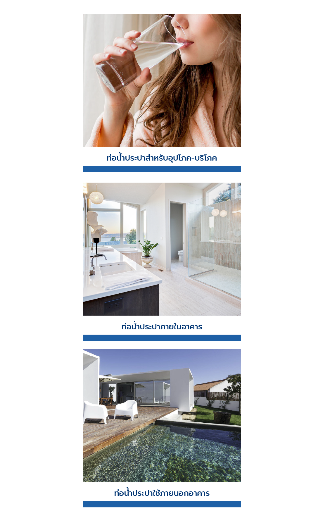 สามารถใช้เป็นท่อน้ำทั้งภายในและภายนอกอาคาร มาพร้อมระบบข้อต่อสวมล็อคที่ติดตั้งง่ายไม่ต้องใช้กาว
