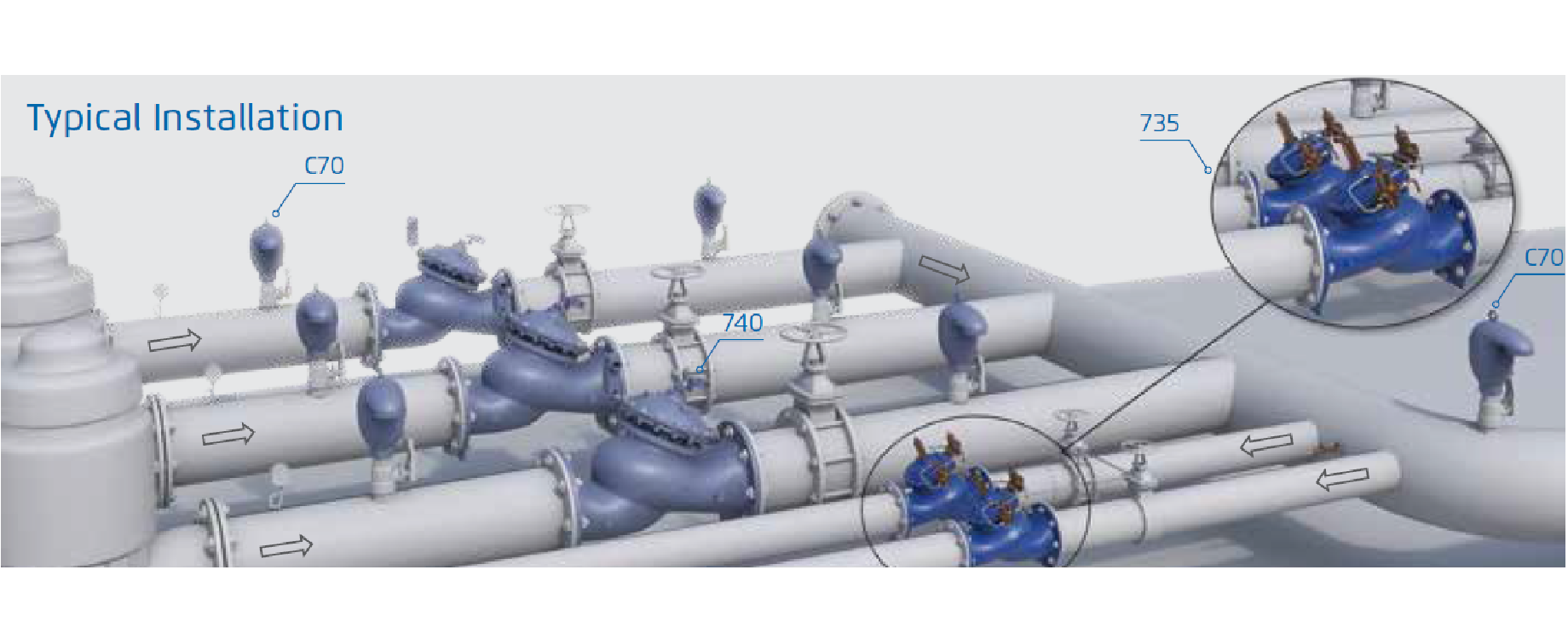 Hydraulically operated off-line surge anticipating valve that immediately opens in response to the pressure drop associated with abrupt pump stoppage. The preopened valve dissipates the returning high pressure wave, eliminating the surge. The valve smoothly closes drip tight as quickly as the relief feature allows, thereby preventing closing surge. The valve also relieves excessive system pressure. BERMAD 700 SIGMA EN/ES series valves are hydraulic, oblique pattern, globe valves with a raised seat assembly and double chamber unitized actuator, that can be disassembled from the body as a separate integral unit. The valves hydrodynamic body is designed for unobstructed flow path and provides excellent and highly effective modulation capacity for high differential pressure applications. The valves are available in the standard configuration or with an Independent Check Feature code “2S”. The 700 SIGMA EN/ES Valves operate under difficult operation conditions with minimal cavitation and noise. They meet size and dimensions requirements of various standards. เยี่ยมชมเว็บไซต์ได้ที่ www.bermad.com