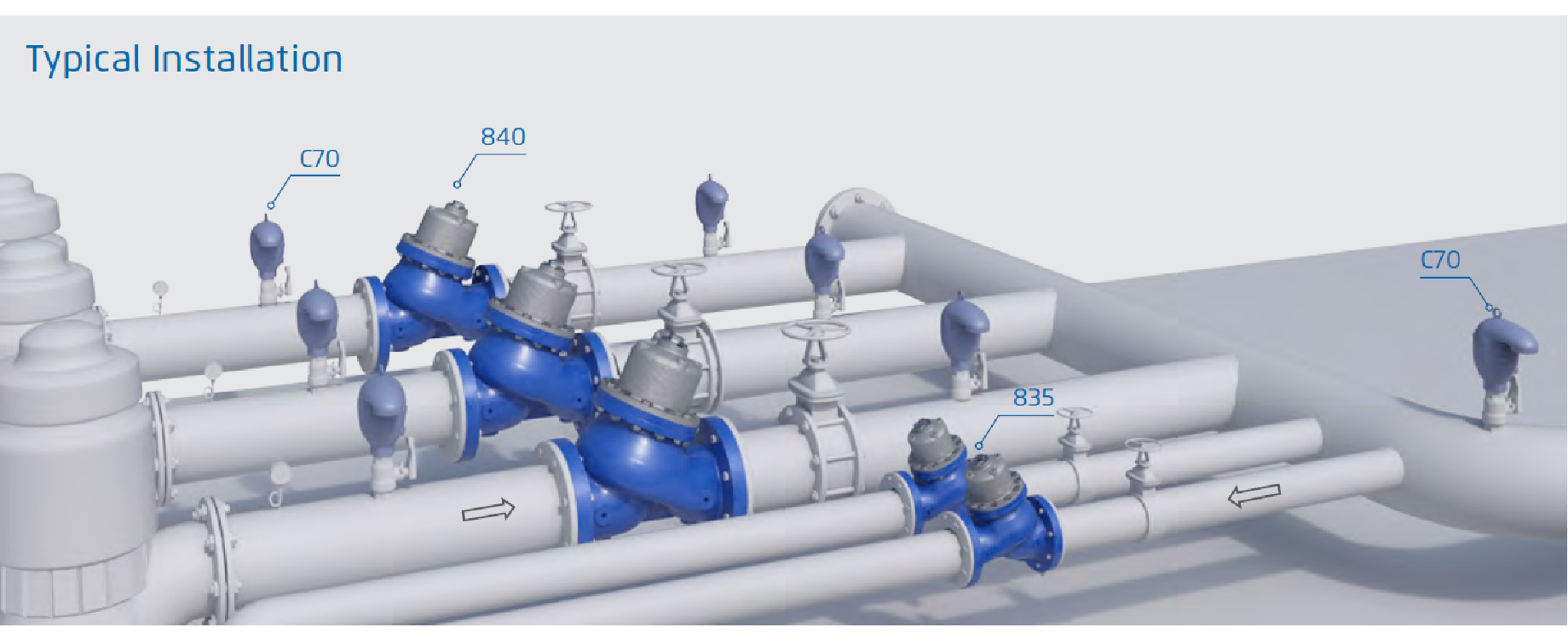 Off-line surge anticipating valve that immediately opens in response to the pressure drop associated with abrupt pump stoppage. The pre-opened valve dissipates the returning high pressure wave, eliminating the surge. The valve smoothly closes drip tight as quickly as the relief feature allows, thereby preventing closing surge. The valve also relieves excessive system pressure. BERMAD 800 series valves are hydraulically operated, piston actuated globe valves designed for high pressure operation and available in either standard oblique (Y) or angle pattern design. Their full bore hydrodynamic body provides an unobstructed flow path while their seat assembly and double-chamber unitized actuator can be disassembled without removing the valve body from the pipeline. เยี่ยมชมเว็บไซต์ได้ที่ www.bermad.com